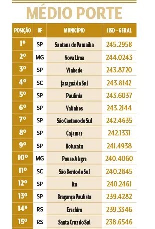 Embora tenha divulgado as colocações, a reportagem não deu detalhes de cada município. Os dados são extraídos de fontes oficiais como IBGE, STN, INEP, Ministério do Desenvolvimento, entre outras bases primárias de informação.