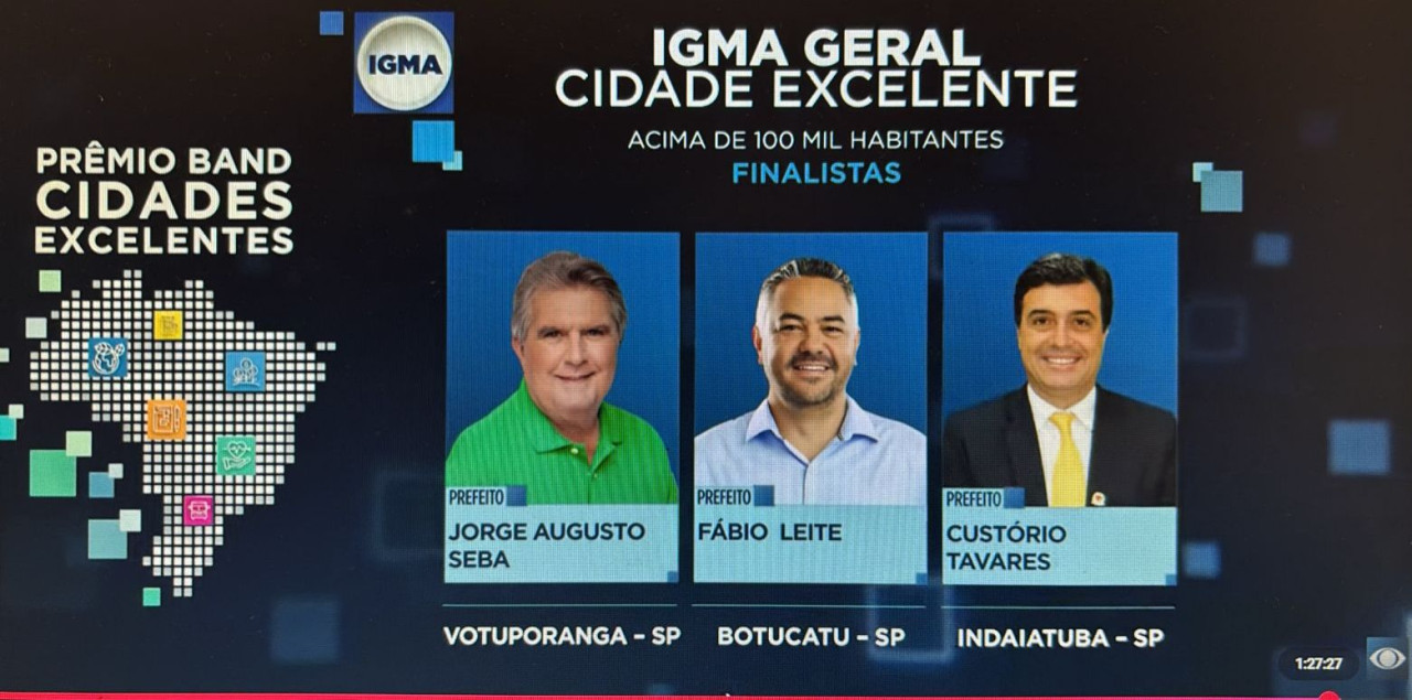Botucatu foi o grande destaque da edição 2025 do Prêmio “Band Cidades Excelentes”, conquistando duas premiações: venceu na categoria Infraestrutura e Mobilidade Urbana e também foi a grande campeã geral do Estado de São Paulo, de acordo com o Índice de Gestão Municipal Aquila (IGMA).