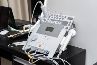 -Inicia o procedimento com aparelhos de tecnologia de ponta, como o Stim Hair, o 3 em 1 com fototerapia, alta frequência e vacuoterapia;