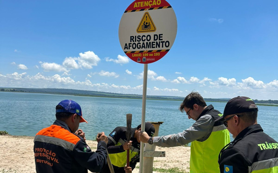 As equipes instalaram novas placas de alerta sobre risco de afogamento no Rio Bonito, além de verificar a sinalização já existente na região da Mina e implantar novas placas preventivas no bairro Alvorada da Barra.