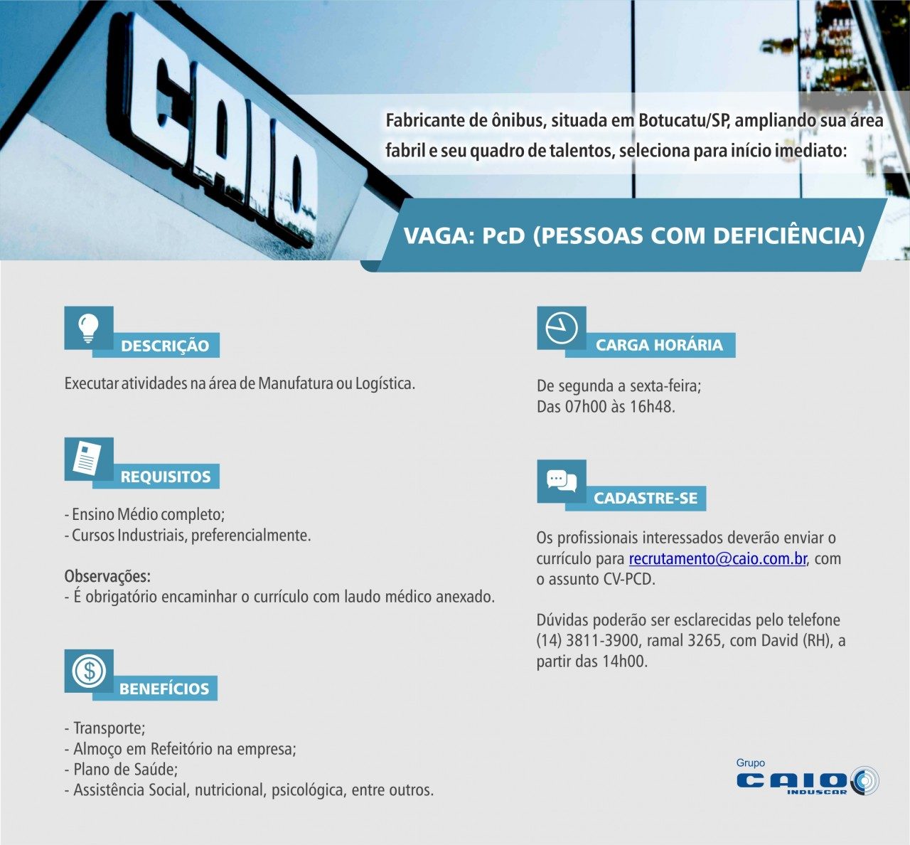 O Grupo Caio informou na tarde desta terça-feira, dia 16, que ainda está recebendo currículos para preenchimento de vagas específicas para PcD (pessoas com deficiência), com urgência.