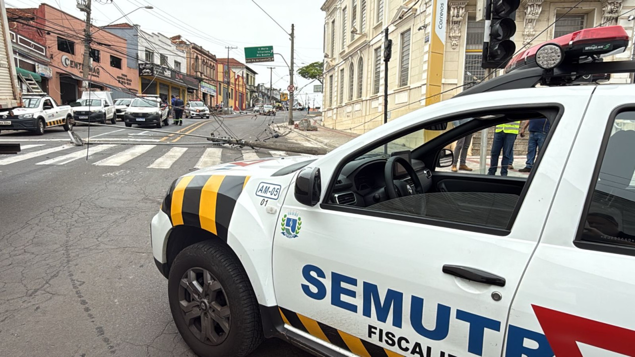 Impacto derrubou um poste próximo aos Correios e interditou o cruzamento; equipes da Defesa Civil e Trânsito atuam no local.