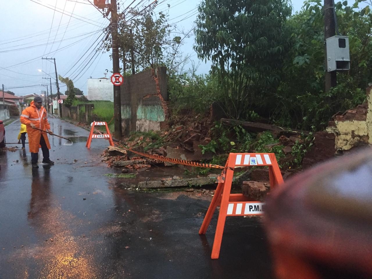 Outro muro não suportou o vento e a chuva e também desabou na rua Lourenço Carmelo no Jardim Paraíso. Ninguém ficou ferido e em ambos os casos de Defesa Civil está trabalhando para minimizar o impacto.