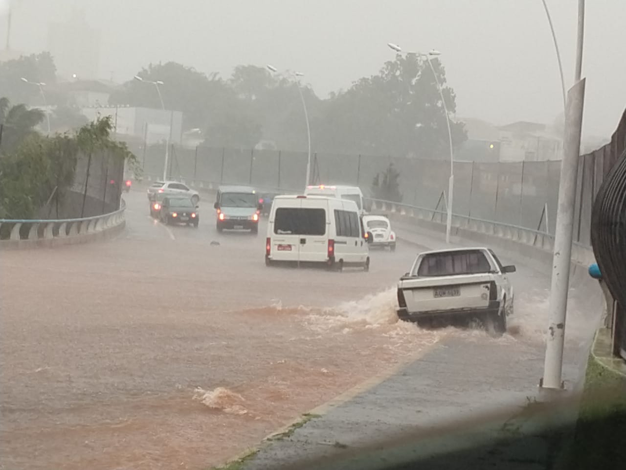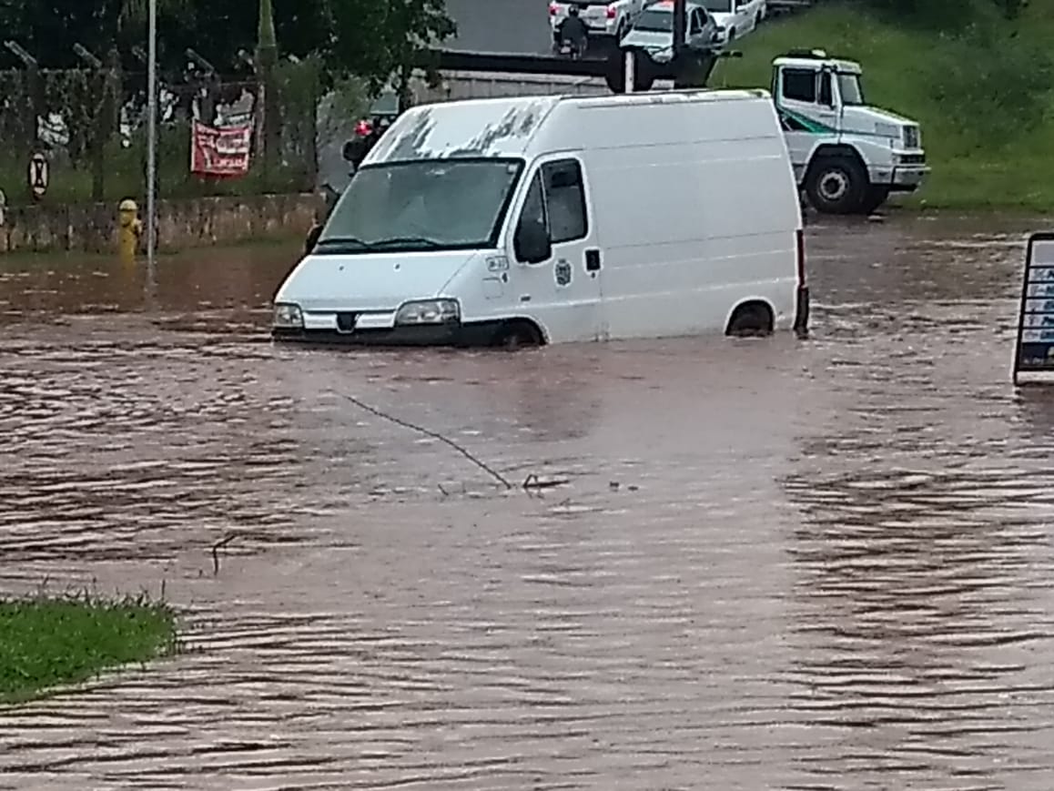 Alguns condutores se arriscavam a atravessar o local e o que se via era desespero de alguns motoristas. Uma van foi flagrada ilhada no meio da água acumulada.