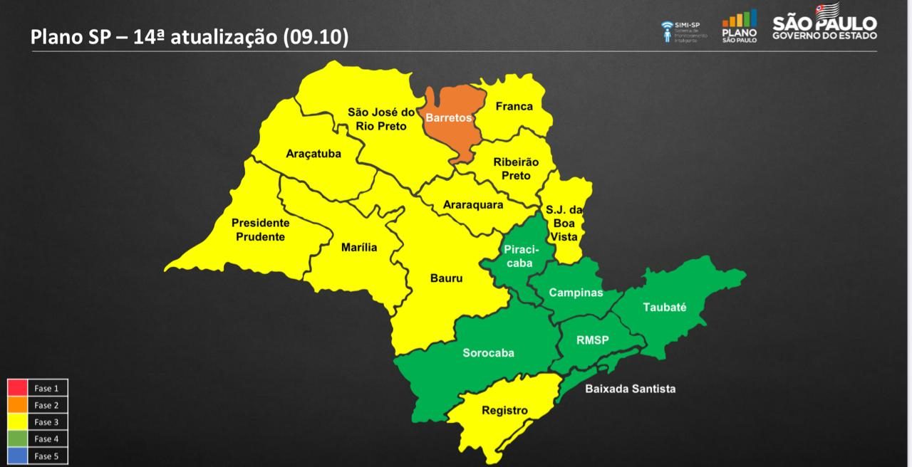 No anúncio de hoje 6 regiões foram para a faixa verde, entre elas Piracicaba, Campinas, Capital Paulista e Baixada Santista. Essas regiões podem funcionar por 12 horas os setores da economia.