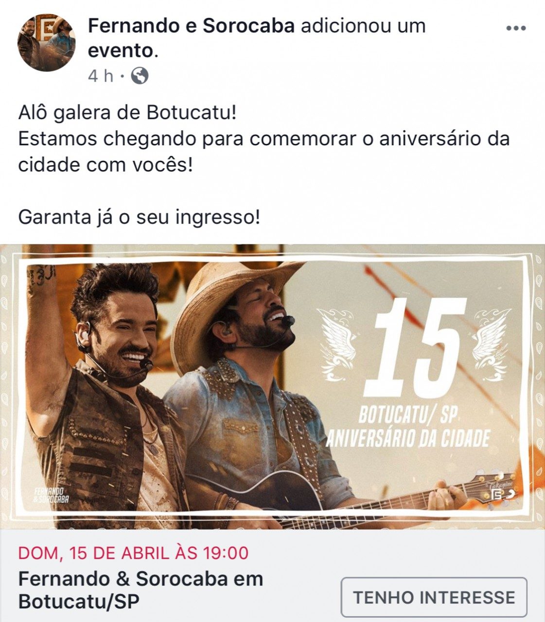 A postagem ainda fala para o público garantir o seu ingresso, o que deve ser um equívoco da dupla. Diversas mensagens foram enviadas ao Acontece Botucatu o fato divulgado pela dupla.