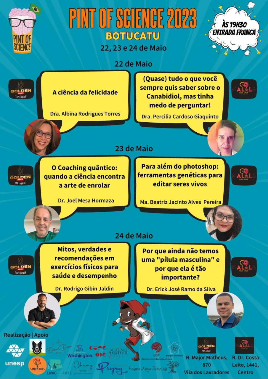 Nos dias 22, 23 e 24 de maio, Botucatu vai receber a 7ª edição do Pint of Science. O evento é um festival internacional de divulgação científica, que conta com apresentação de cientistas em bares e restaurantes da cidade, conversando com a população sobre temas relevantes numa linguagem acessível. Ao todo, 383 cidades em 26 países realizarão o Pint em 2023.