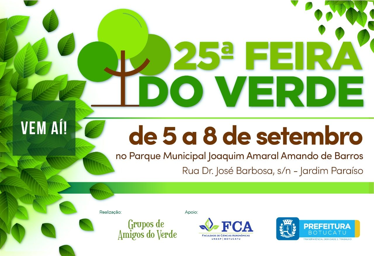 Entre os dias 05 e 08 de setembro, das 9 às 22 horas, o Grupo Amigos do Verde, com o apoio da Secretaria Municipal do Verde e da Faculdade de Ciências Agronômicas da Unesp de Botucatu, realizará a 25ª edição da Feira do Verde.