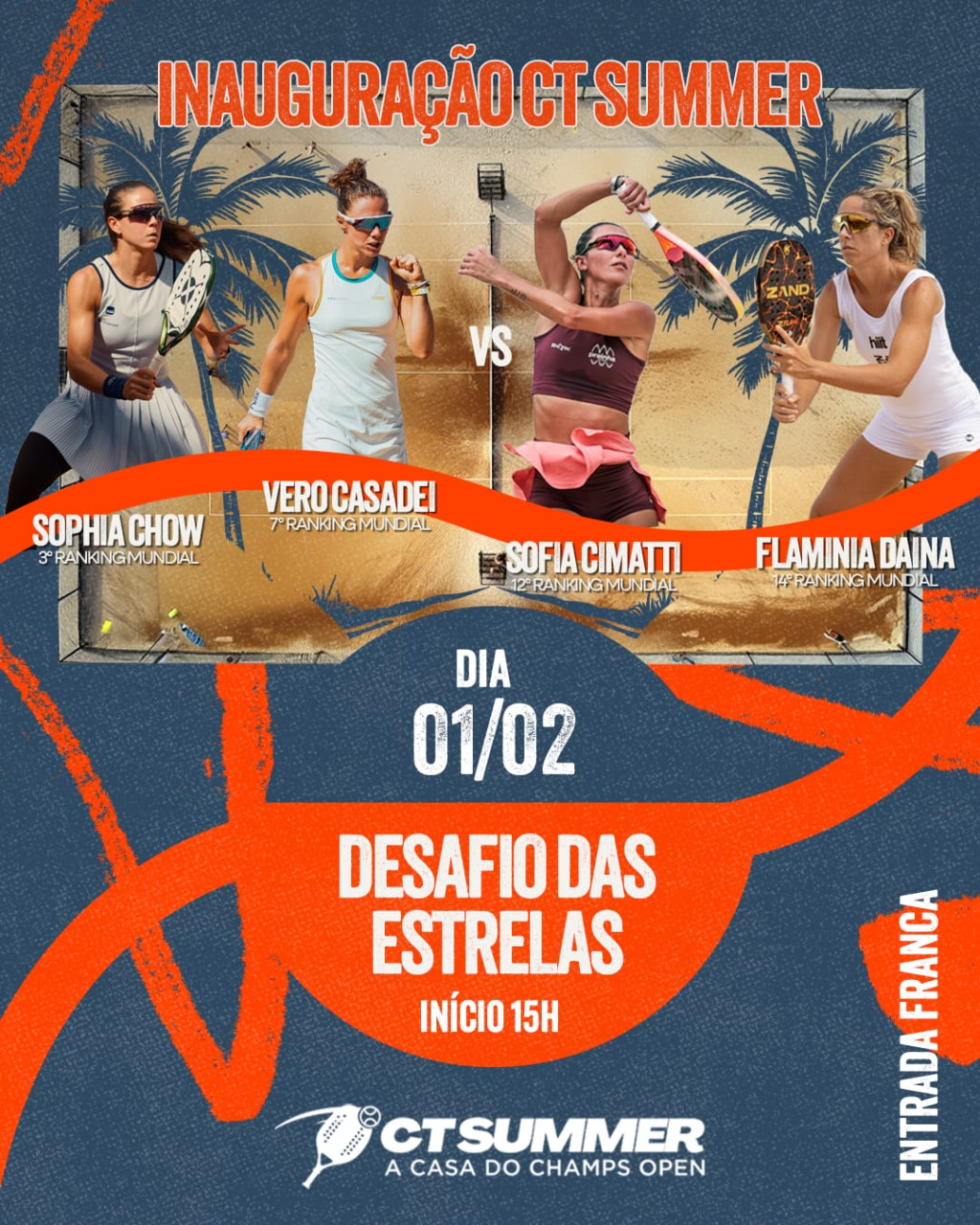 Entre os destaques da programação está o jogo principal da noite, que colocará frente a frente as atletas Sophia Chow, do Brasil, e Vero Casadei, da Itália, contra a dupla italiana formada por Sofia Cimatti e Flaminia Daina. O confronto promete alto nível técnico e um grande espetáculo para os fãs da modalidade.