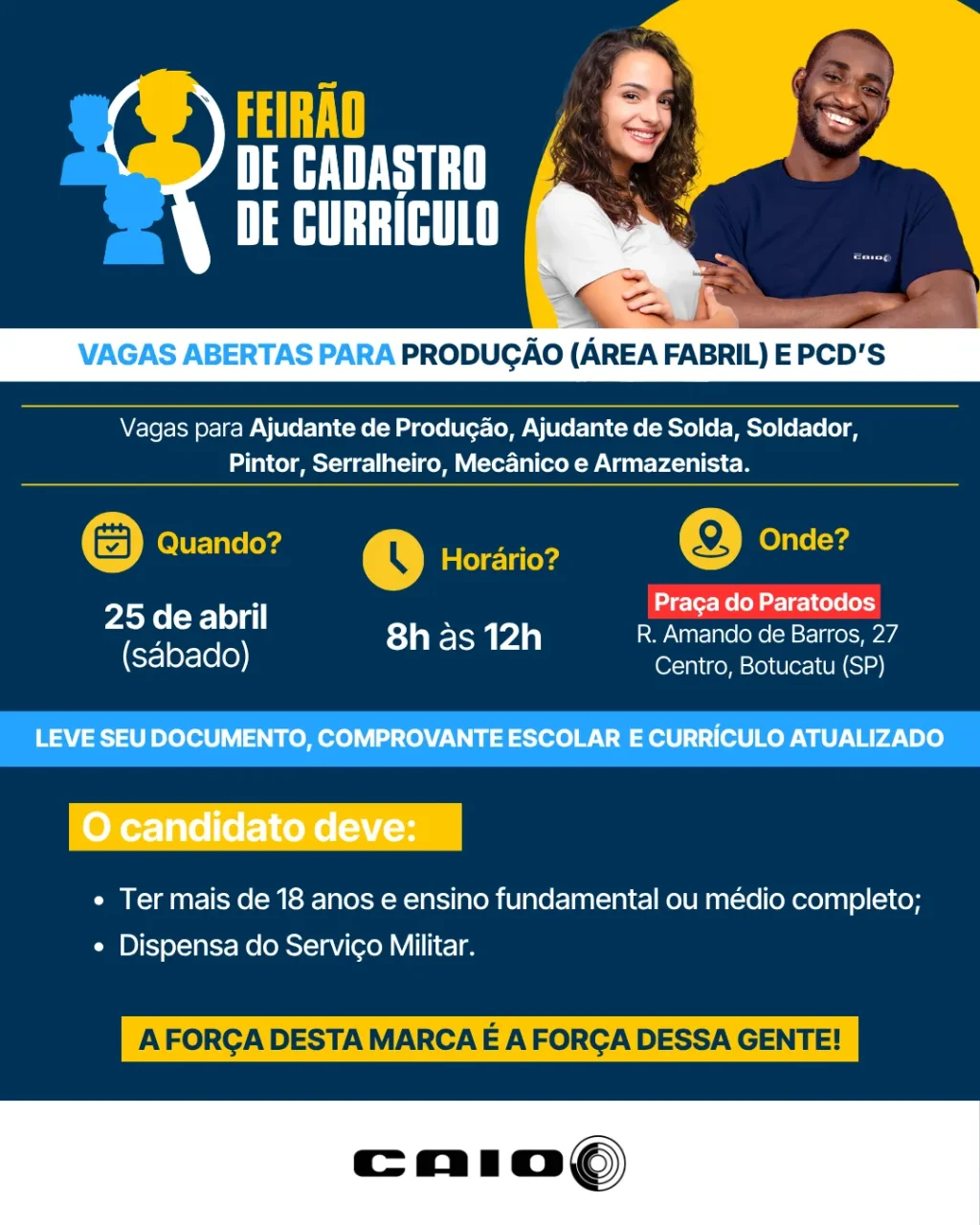 O Grupo Caio promove neste sábado, 25 de abril, um feirão de cadastro de currículos em Botucatu. A ação será realizada das 8h às 12h, na Praça do Paratodos, na região central da cidade, com foco na formação de banco de talentos para as empresas do grupo. O objetivo é ampliar o contato direto com candidatos e facilitar o acesso às oportunidades, reunindo profissionais de diferentes perfis e níveis de experiência em um único espaço.