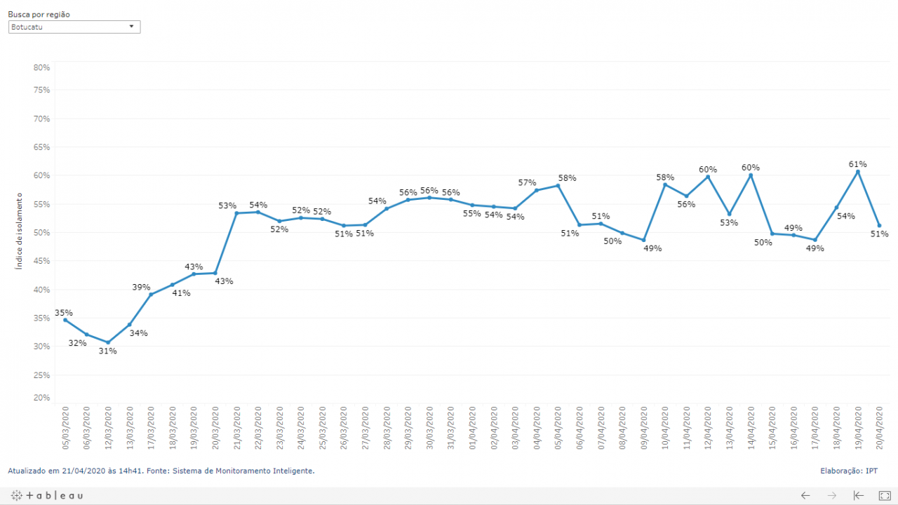 O Sistema de Monitoramento Inteligente (SIMI-SP) do Governo de São Paulo mostra que o percentual de isolamento social em Botucatu foi de 51% nesta segunda-feira (20). Esse foi o mesmo número na média do estado.