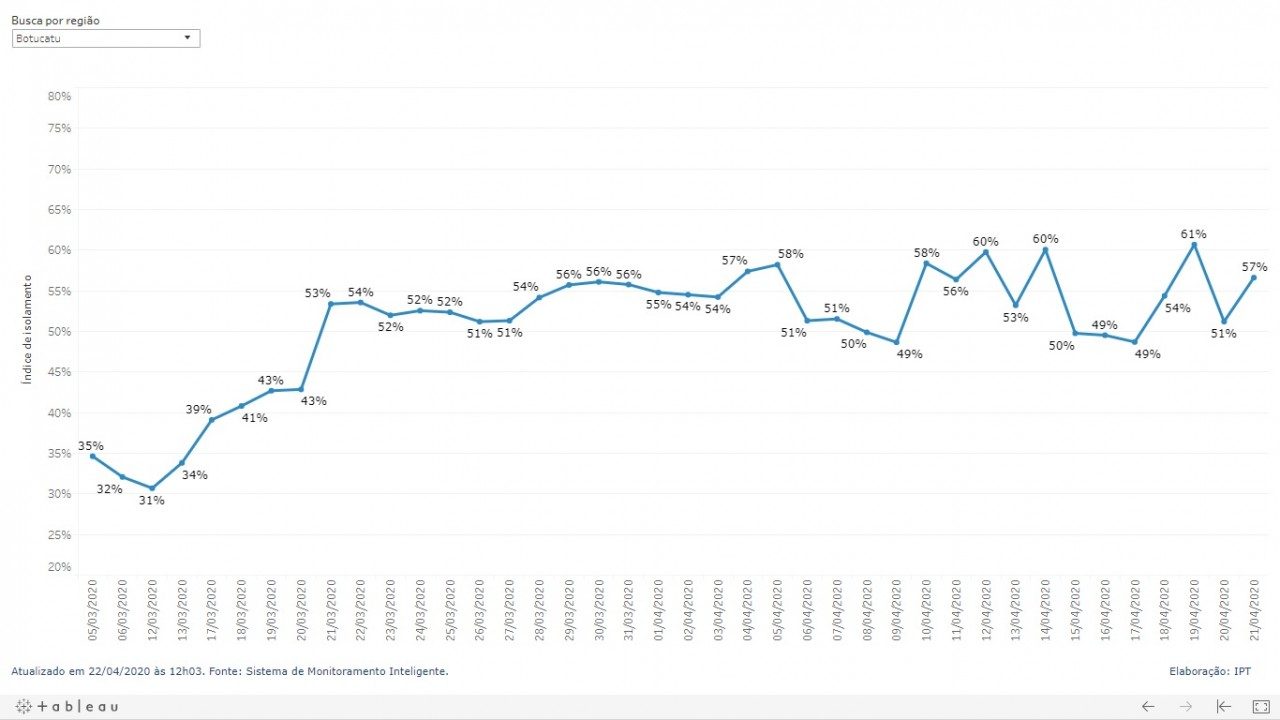 O número em Botucatu, segundo essa medição, chegou a 61% no último domingo, dia 19. Já na segunda-feira, 20, foi registrado 51%. A medição começou em 05 de março, quando a cidade apontou 35% (veja gráfico abaixo).