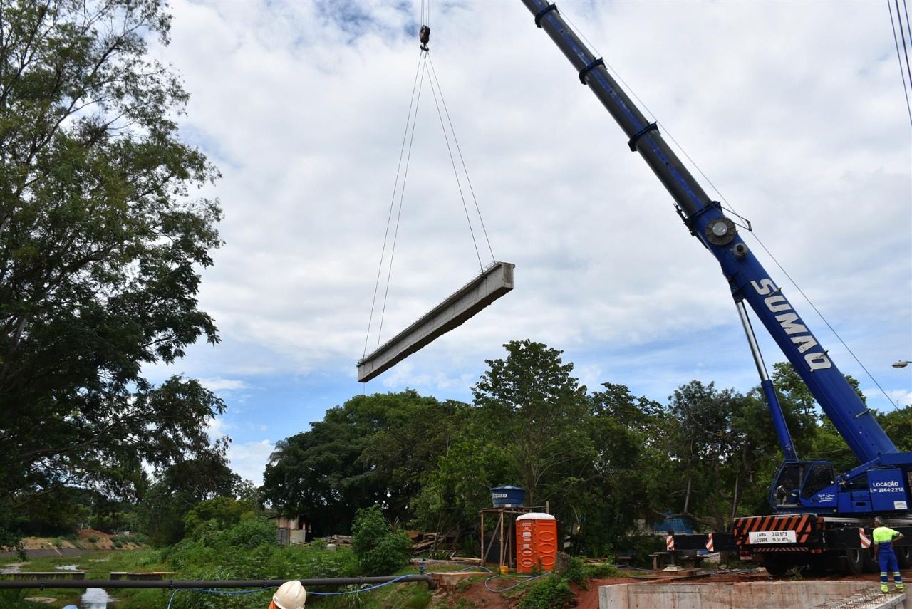 Um grande guindaste realizou o içamento das vigas da ponte da Rua Antônio Bernardo, no Centro da Cidade, nesta terça-feira, 15.
