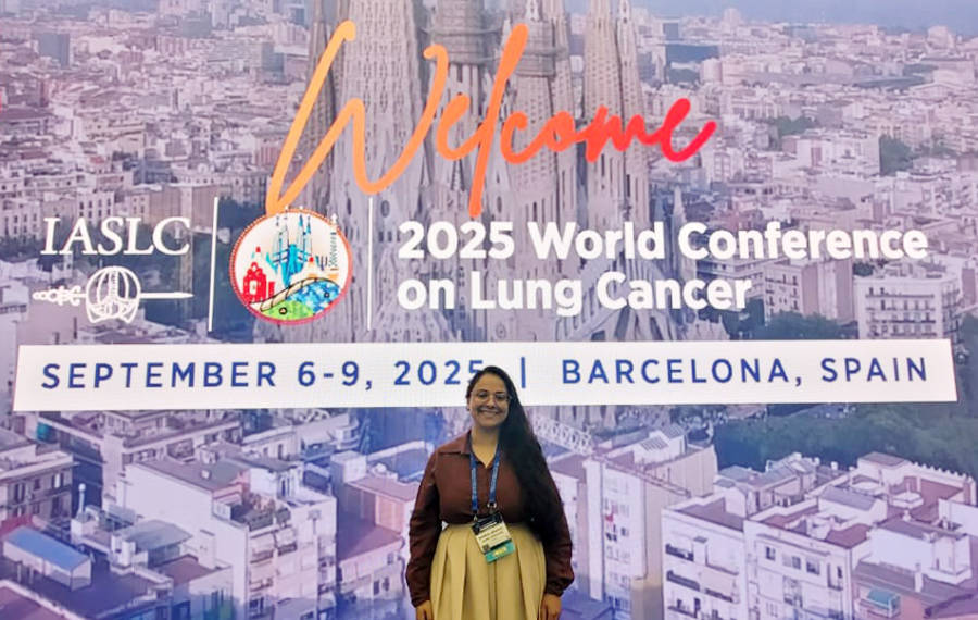 A médica Maria Raquel Gomes Fernandes, doutoranda do Instituto de Biociências da Unesp em Botucatu (IBB), foi uma das dez pesquisadoras do mundo a receber o Prêmio de Educação para Países em Desenvolvimento, concedido pela Associação Internacional do Câncer de Pulmão (IASLC). O reconhecimento levou a brasileira à Conferência Mundial de Câncer de Pulmão 2025, realizada em setembro, em Barcelona (Espanha), onde apresentou os primeiros resultados de sua pesquisa de doutorado desenvolvida em Botucatu.