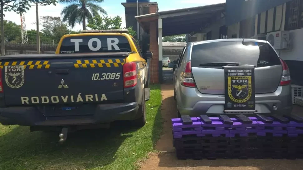 Durante a fiscalização, os policiais abordaram um Renault Sandero prata, conduzido por um homem de 41 anos. Ao inspecionarem o veículo, os agentes encontraram diversos tabletes de maconha escondidos no porta-malas. Após a pesagem, o material totalizou 103,3 quilos.
