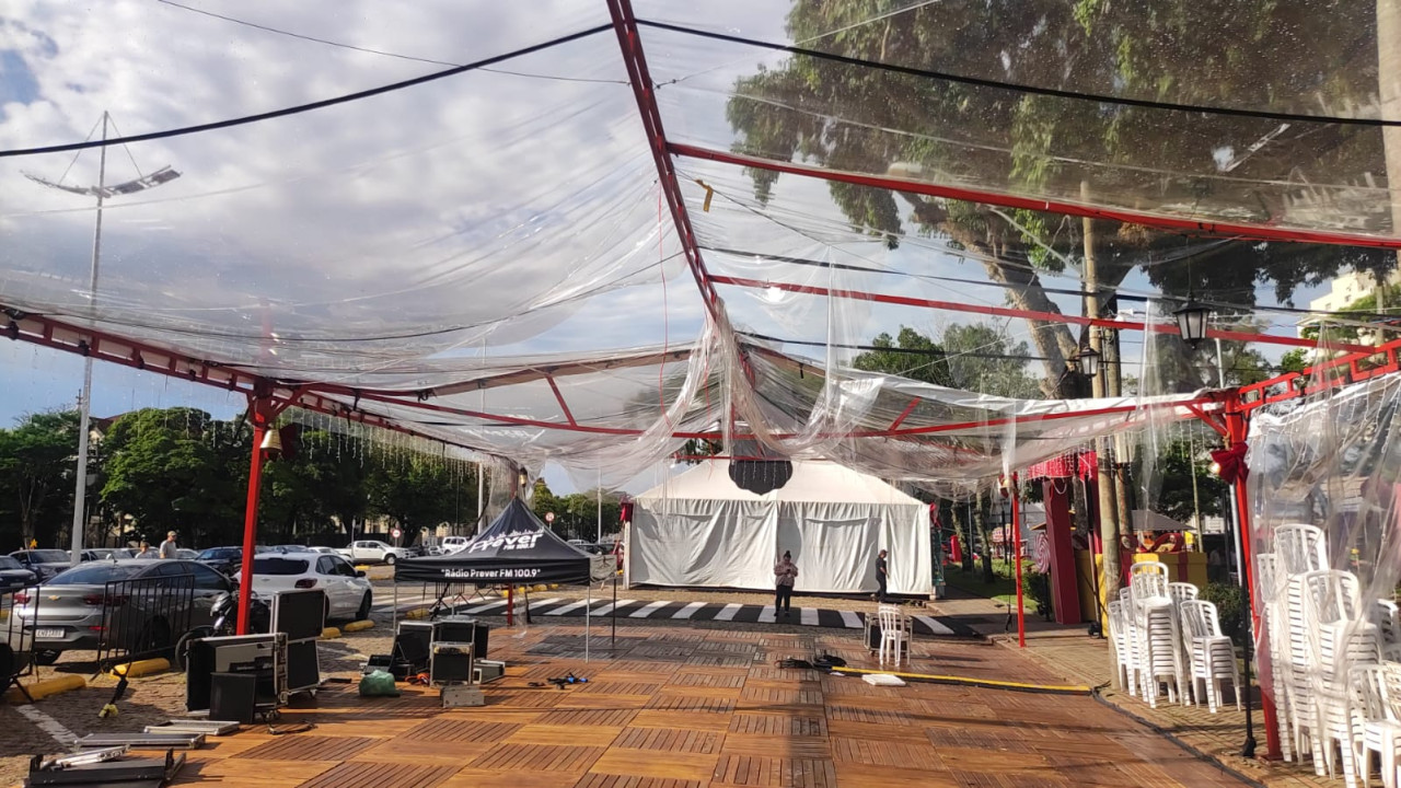 Chuva e ventos fortes danificaram parte da estrutura montada na Praça Rubião Junior e exigem manutenção para garantir segurança do público.