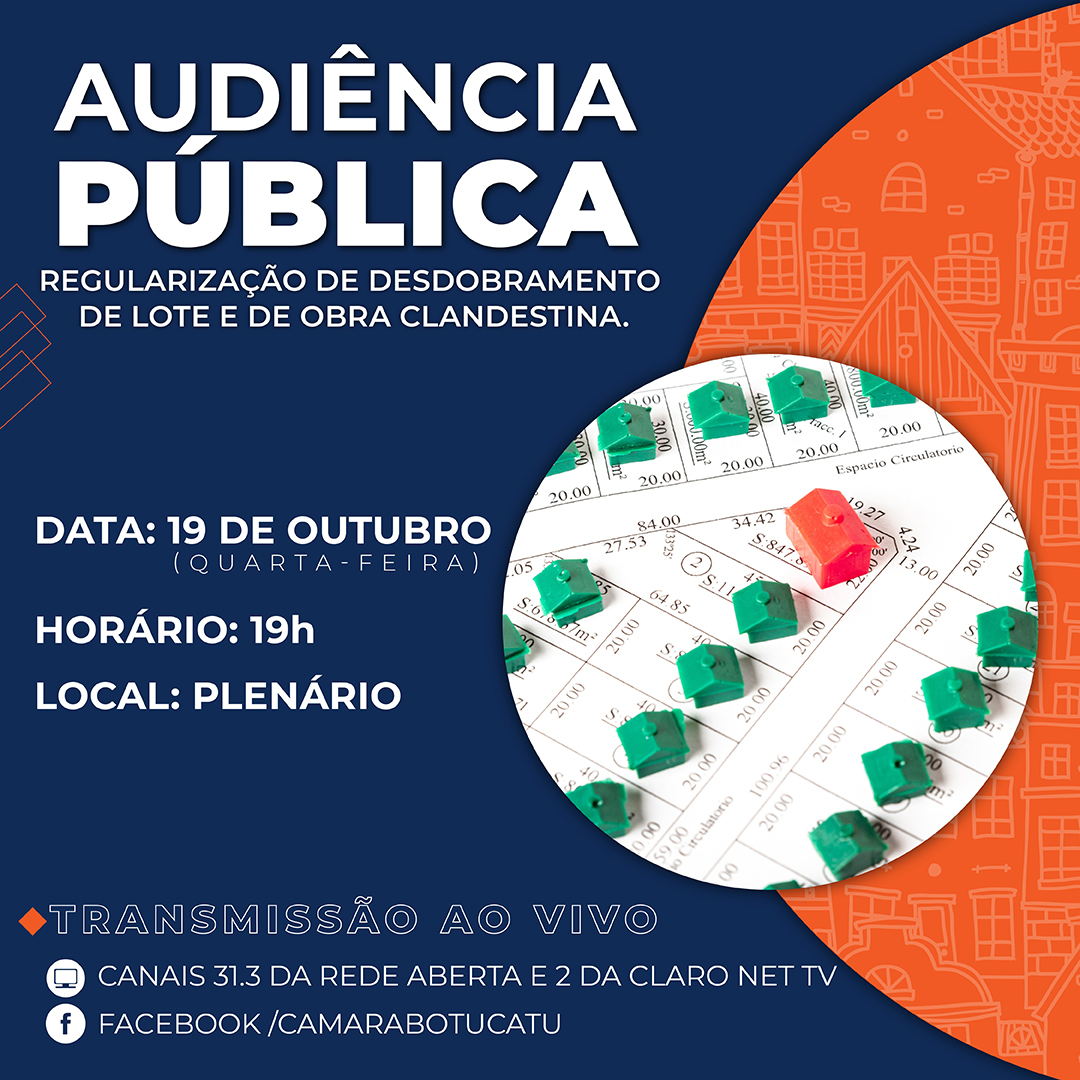 A audiência acontece no dia 19/10, às 19h, na sede do Legislativo. O público pode acompanhar presencialmente ou pelos canais de comunicação da Câmara.