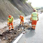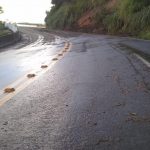 Além da retirada de pedras e terra que desmoronaram na pista, a empresa trabalha na recuperação de erosões no bordo do trecho e também na reconstrução de canaletas de águas pluviais.