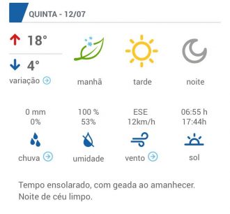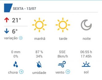 No sábado, 14, a temperatura terá ligeira alta, mas a mínima ficará entre 6 e 7 graus. Já no domingo os termômetros podem chegar a 21 graus, como mínima de 9 graus. Não há previsão de chuva para os próximos dias.