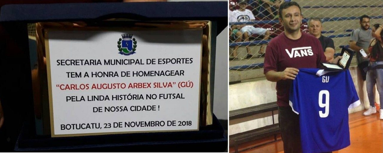 Tal fato aconteceu conosco no último dia 23/Nov/2018 quando por ocasião da solenidade de encerramento do bem organizado Campeonato de Futsal da cidade, séries ouro e prata, nosso filho CARLOS AUGUSTO ARBEX SILVA, o GU, na oportunidade atleta do CUESTA F.C., recebeu da SECRETARIA DE ESPORTES DO MUNICIPIO singela homenagem pelos bons serviços prestados ao esporte da bola pesada de nossa terra.