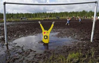 A foto anexa nos mostra a dura vida da profissão de goleiro, pois durante a disputa de uma partida amistosa de nossa equipe na zona rural, o guarda-valas MARCOLIN ficou irremediavelmente enterrado embaixo dos três paus, impossibilitado de qualquer movimentação após um temporal que desabou sobre o campo de batalha, não podendo assim evitar os cinco gols que tomamos naquele empate por 5×5 com a equipe da casa.