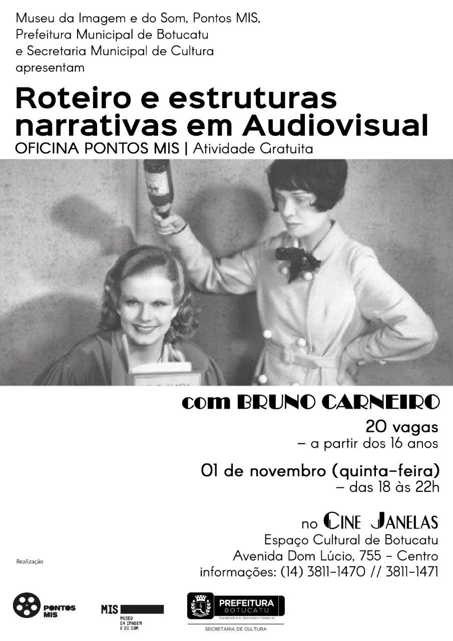 A oficina “Roteiro e Estrutura Narrativa de Audiovisual” será realizada no dia 01 de novembro, das 18 às 22 horas no Espaço Cultural “Dr. Antônio Gabriel Marão” (Cine Janelas). A participação é gratuita, aberta para maiores de 16 anos. São 20 vagas e é necessária a inscrição prévia por e-mail ([email protected]) ou pessoalmente no Espaço Cultural (Rua General Teles, 1738).