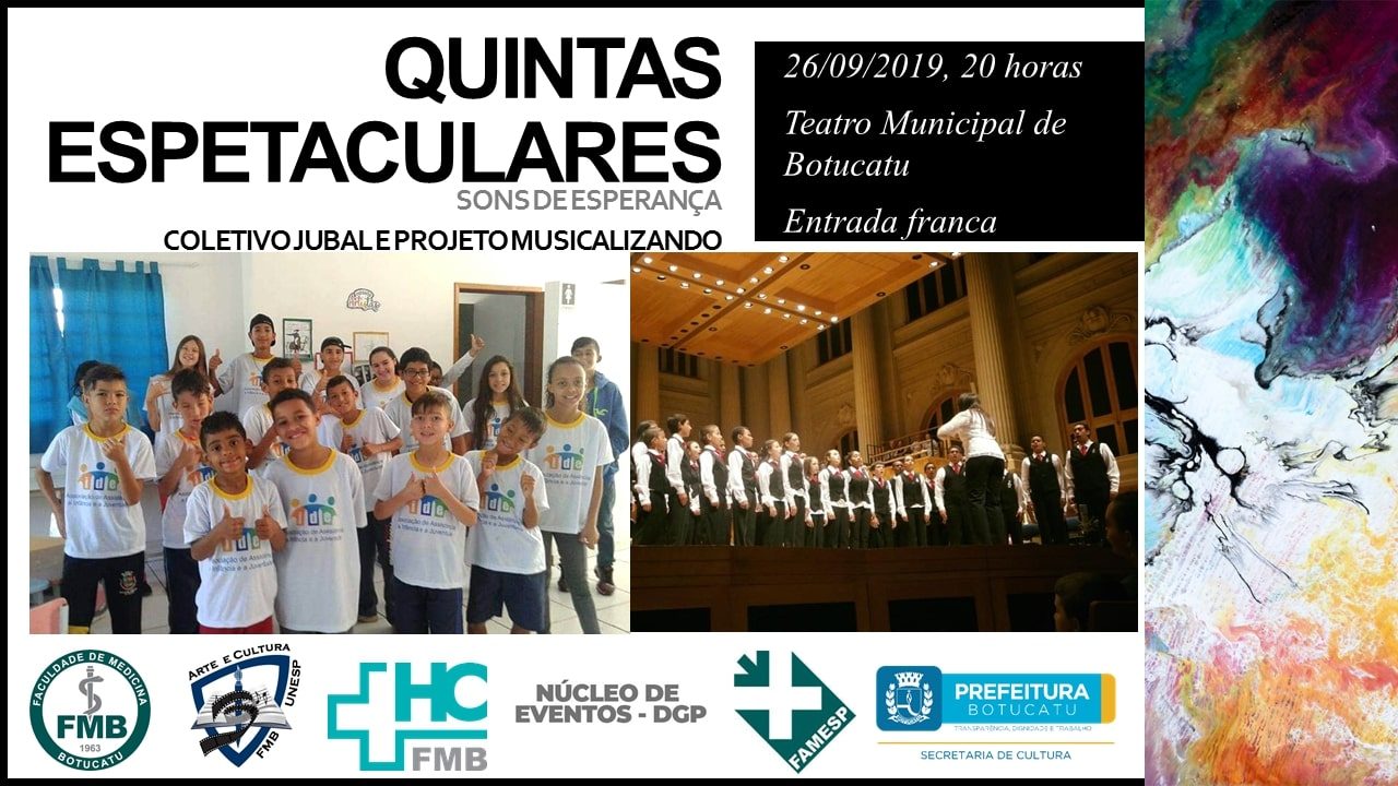 O projeto Quintas Espetaculares, do Comitê de Ação Cultural (CAC) da Faculdade de Medicina de Botucatu (FMB/Unesp), promove mais um espetáculo musical na próxima quinta-feira, 26, às 20 horas, no Teatro Municipal de Botucatu, com as crianças e adolescentes do Coletivo Jubal e o Projeto Musicalizando. A entrada é franca e toda comunidade está convidada a prestigiar.