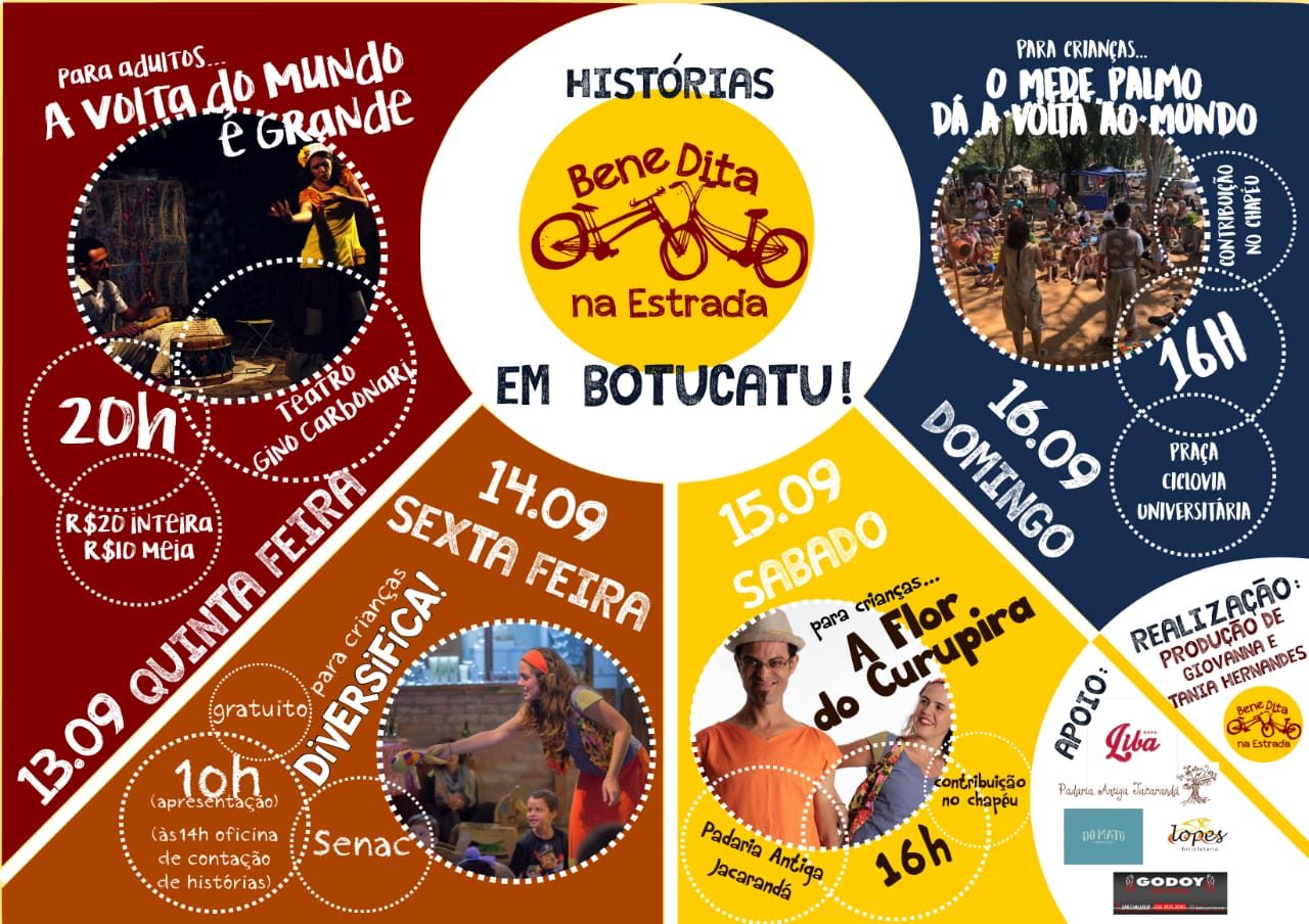 A Cia Benedita na Estrada viaja por todo o Brasil de bicicleta ouvindo, contando e vivendo histórias. E agora estamos em Botucatu trazendo uma programação bem completa com quatro espetáculos