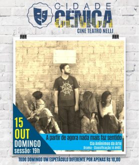 A Mostra “Cidade Cênica” leva três espetáculos para o Cine Teatro Nelli durante o mês de outubro. A mostra, que é sucesso de público todos os meses, visa fomentar a cultura, oferecendo a população opções de peças a preços populares, sempre a R$ 10,00.