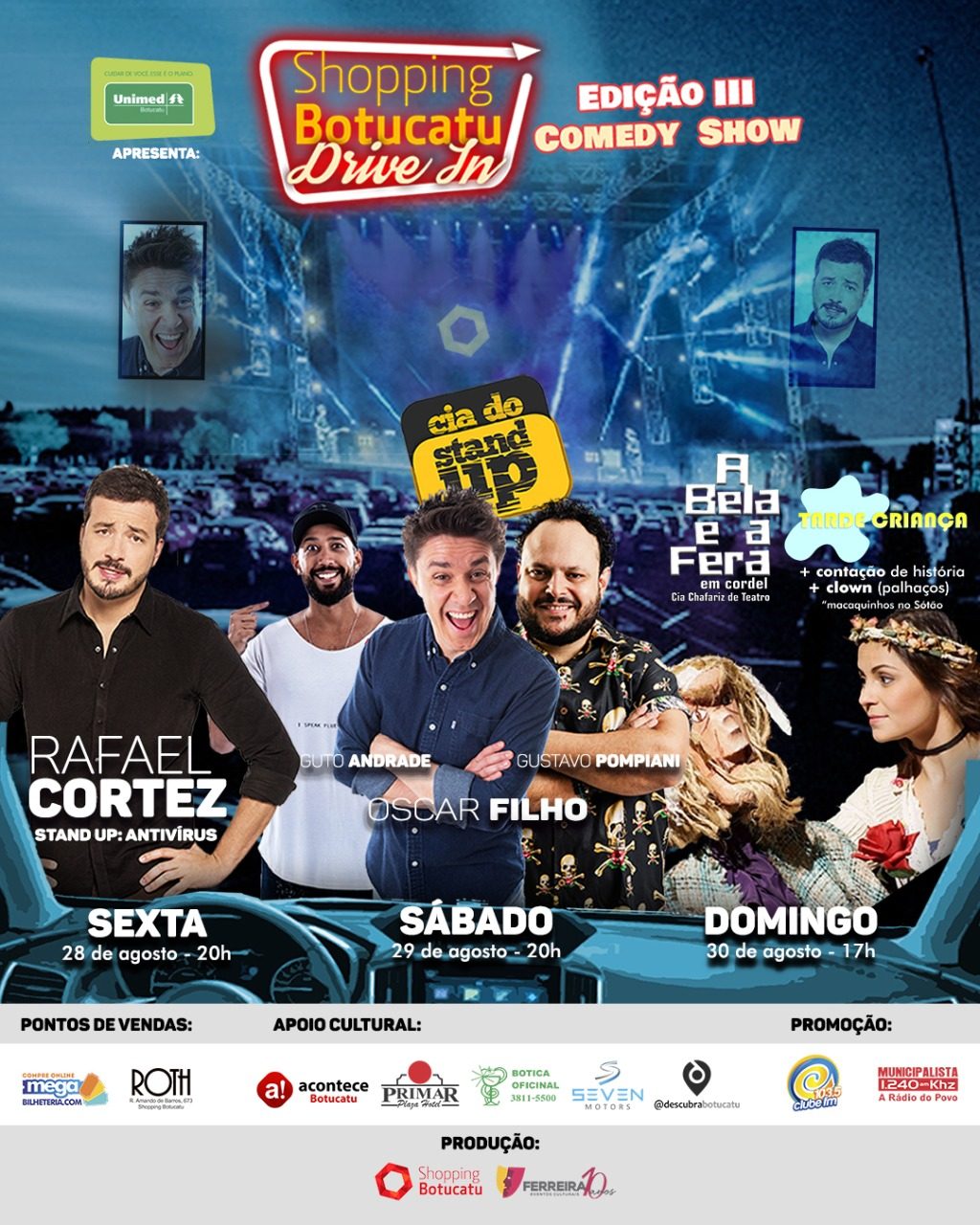 Nos dias 28, 29 e 30 de agosto o estacionamento do Shopping Botucatu recebe mais uma vez um evento Drive-In, está será a terceira edição desse formato de evento na cidade, sempre realizado no Shopping em parceria com a Ferreira Eventos Culturais. A novidade desta edição é um dia voltado especialmente para as crianças, onde as famílias poderem se divertir com espetáculos Infantis, comenta Wagner Ferreira da produção do evento.