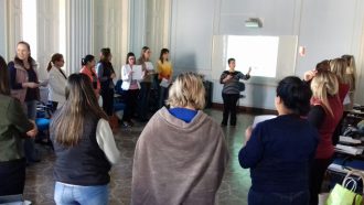 Nesta quinta-feira (18) a curadora da exposição, Célia Barros, esteve no Salão Azul da Secretaria Municipal de Educação promovendo um encontro de formação em artes direcionado a professores da Rede Pública Municipal.