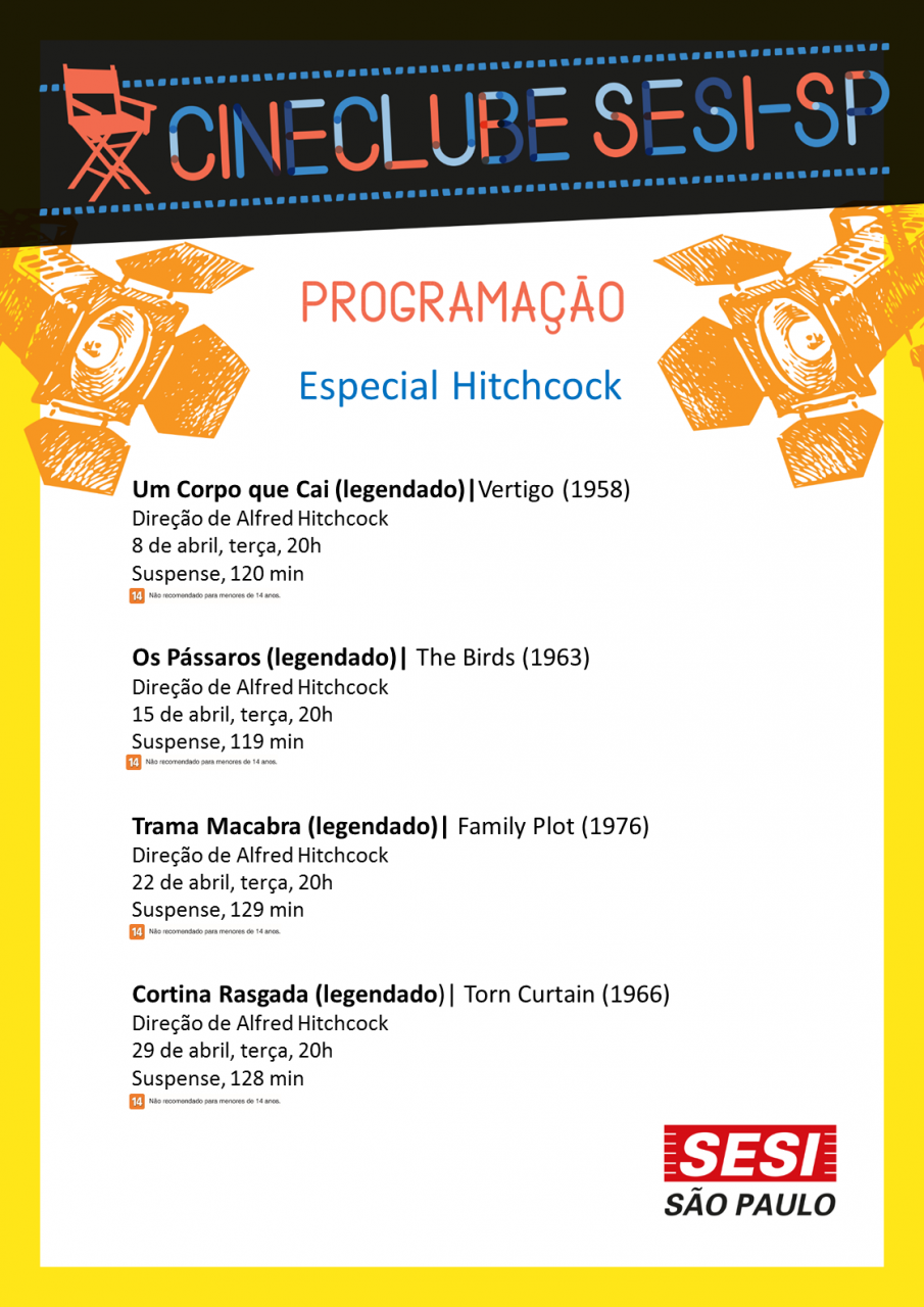 No mês de maio, o Cineclube SESI-SP apresenta grandes sucessos em homenagem ao ‘Mestre do Suspense’, Alfred Hitchcock. As sessões acontecem a partir do dia 08 de maio, toda terça-feira, às 20h e a entrada é gratuita.