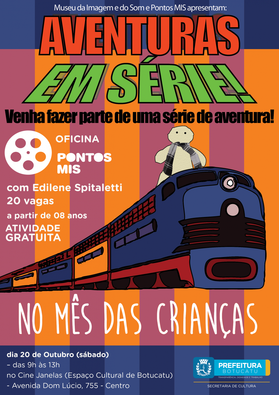 Estão abertas as inscrições para a oficina “As Aventuras em Série” do Ponto MIS, promovida pela Secretaria Municipal de Cultura. A oficina é feita para quem curte e quer se aventurar no universo das séries e seriados. Com curiosidades, análises de personagens, episódios e cenas, dos clássicos aos atuais, cada aluno poderá aprender com conceitos teóricos os desafios da narrativa seriada.