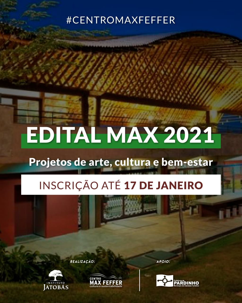 Atenção, artistas, produtores culturais e empreendedores criativos de Pardinho e região! O Instituto Jatobás está selecionando propostas para compor a programação presencial e online do Centro Max Feffer – Cultura e Sustentabilidade (CMF). O período de inscrições para o edital Programação Cultural do Max 2021 se estende até 17 de janeiro e o resultado será divulgado em 26 do mesmo mês.