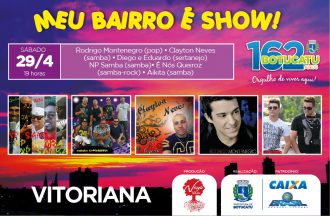 A Prefeitura de Botucatu, através da Secretaria Municipal de Cultura, promove neste sábado (29), em Vitoriana, mais uma edição do Meu Bairro é Show, que faz parte do calendário de eventos alusivos ao mês de aniversário de Botucatu. A música rola solta a partir das 18 horas, no cruzamento das ruas Antonio Sandre e Duque de Caxias – em frente ao posto de saúde do distrito. Tudo de graça.