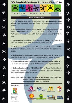 A programação vai até o dia 16 de dezembro (confira programação) com espetáculos de dança, musicais e peças teatrais. Ingressos à venda na secretaria da Artistas S/A, Rua Visconde do Rio Branco, 1500.