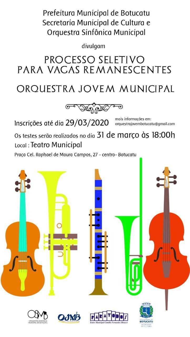 A Prefeitura de Botucatu, por meio da Secretaria Municipal de Cultura, divulga as vagas remanescentes para a Orquestra Jovem Municipal de Botucatu, a OJMB. Poderão se inscrever jovens de até 21 anos e que possuam formação musical intermediária ou avançada.