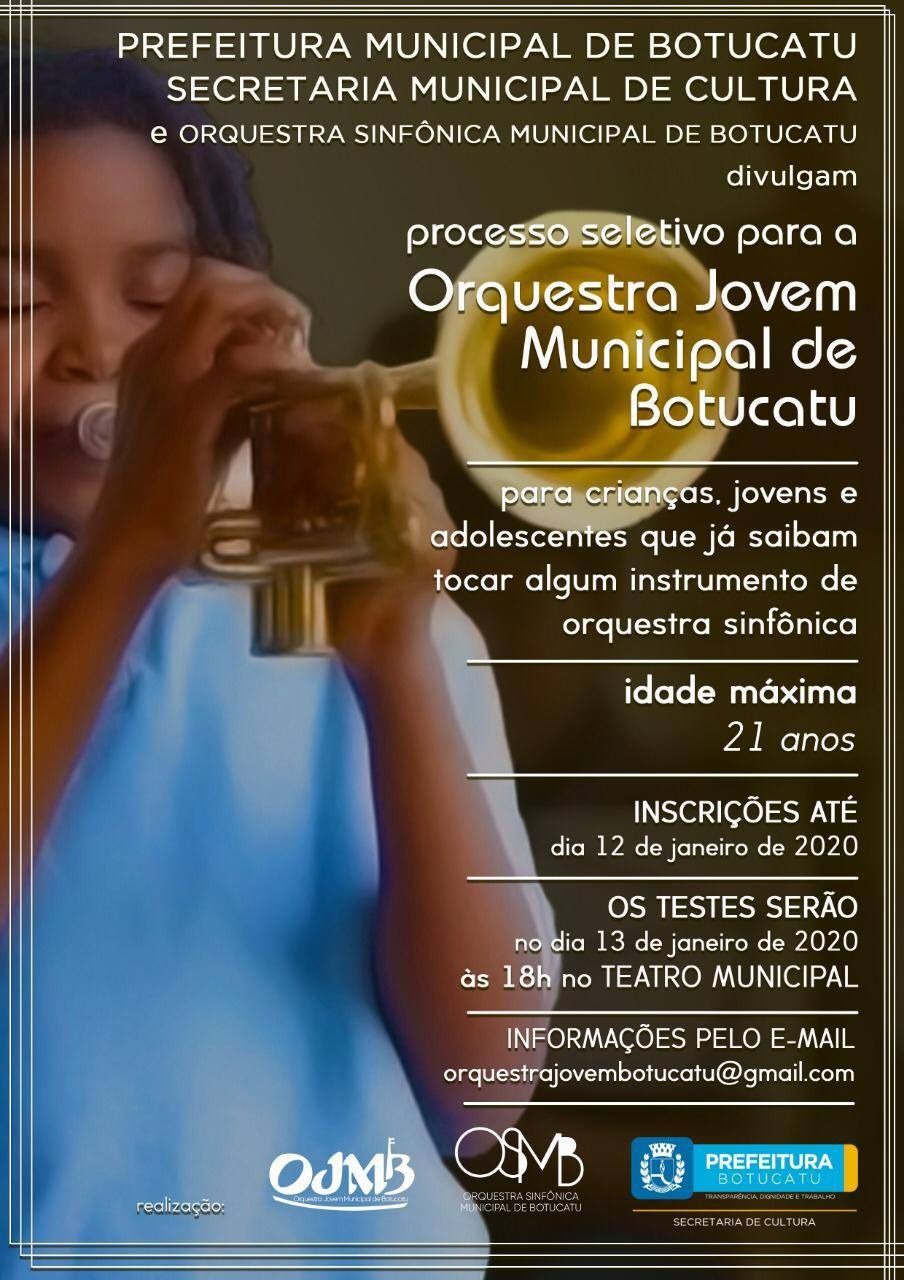 Estão abertas as inscrições para o processo seletivo de músicos da OJMB, a Orquestra Jovem Municipal de Botucatu. A OJMB, que é um braço pedagógico da Orquestra Sinfônica Municipal de Botucatu (OSMB), tem como objetivo principal a preparação de jovens músicos para o trabalho em conjunto e profissionalização, para futuramente ingressarem na OSMB.