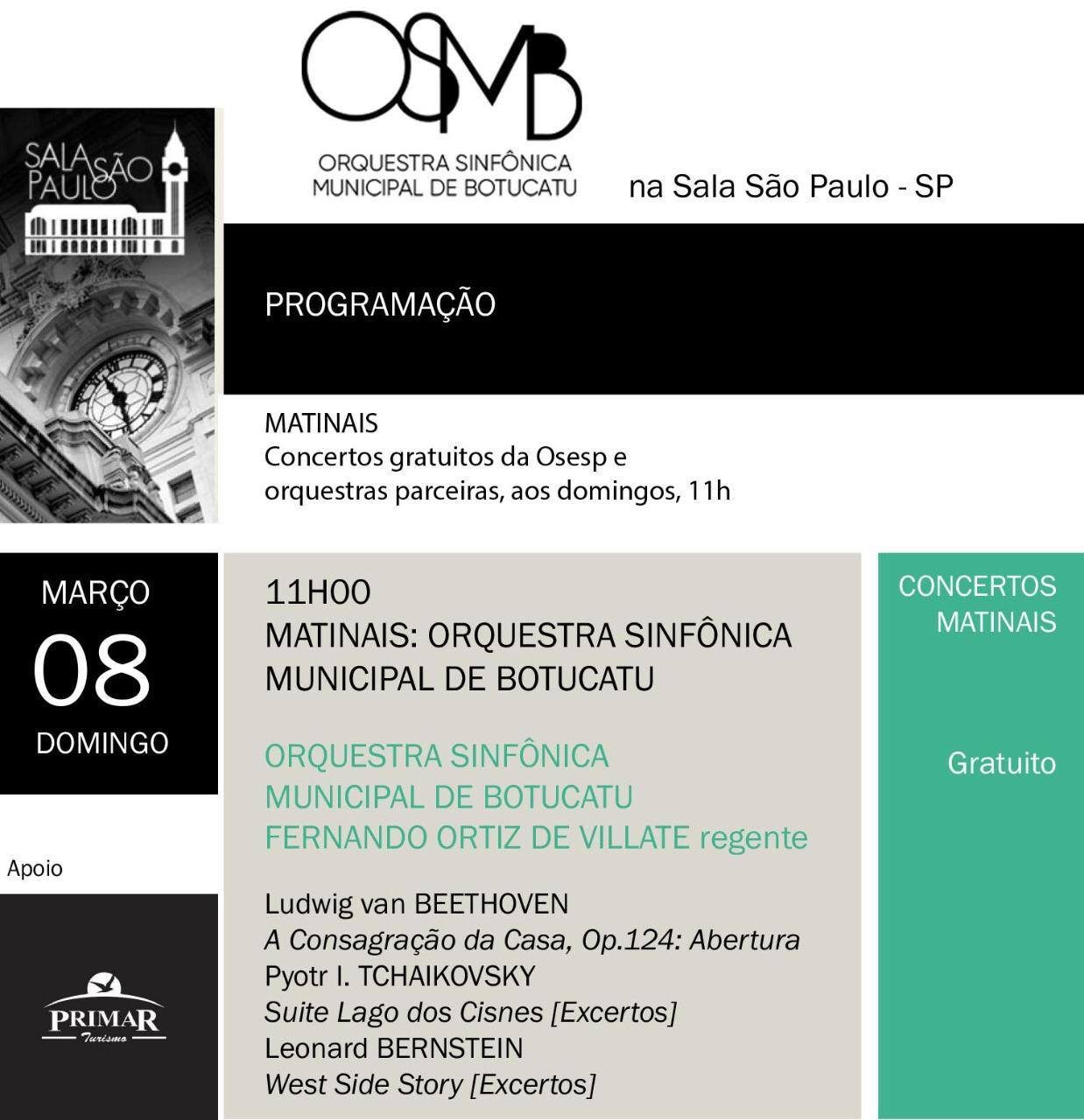 A Orquestra Sinfônica Municipal de Botucatu, OSMB, irá se apresentar no próximo domingo, 08, na Sala São Paulo, uma das principais casas de concerto do Brasil e do mundo, localizada na capital paulista.