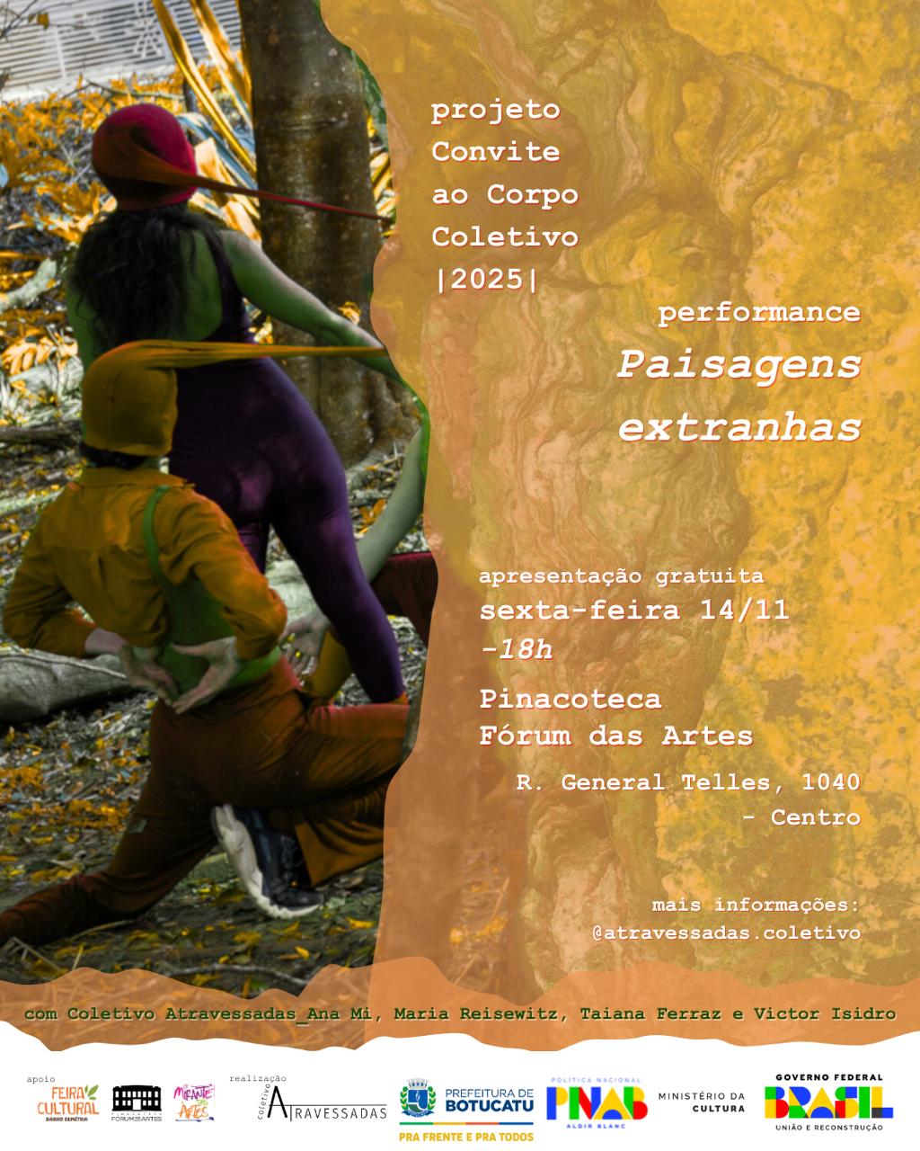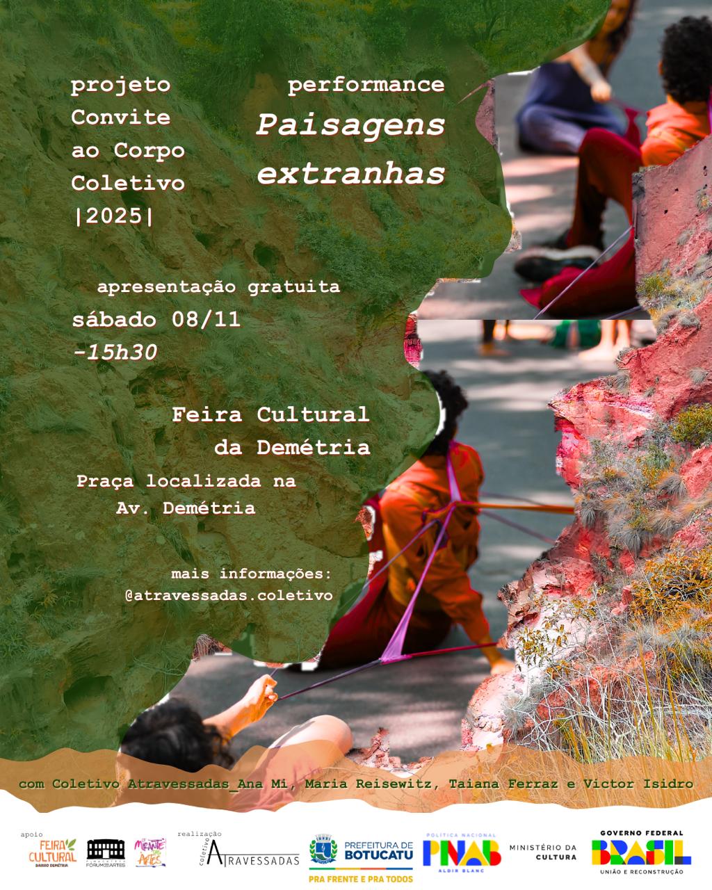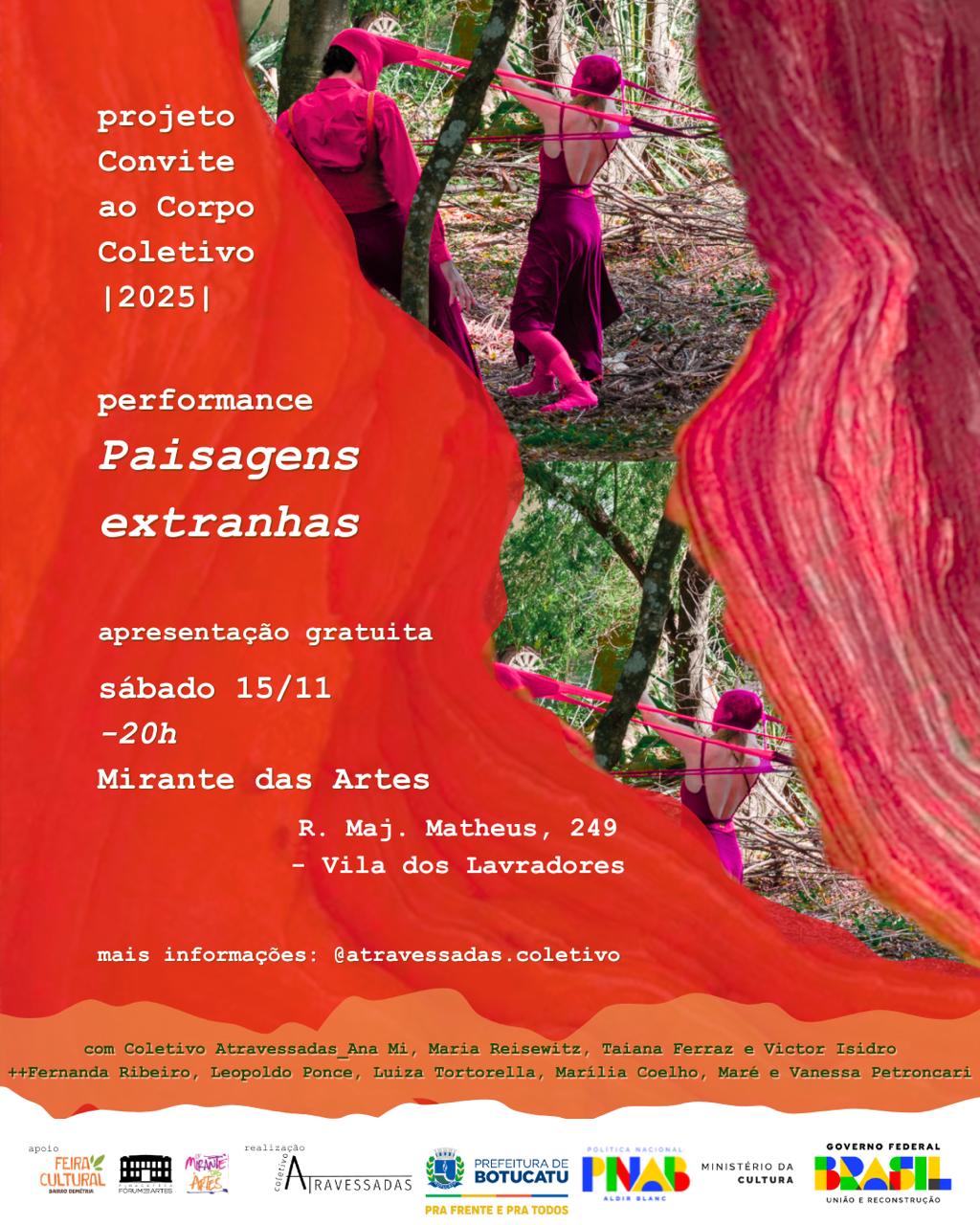 Nos próximos dois finais de semana, Botucatu recebe as apresentações da performance de dança “Paisagens Extranhas”, uma criação do Coletivo Atravessadas em parceria com a artista da dança Maria Reisewitz. A performance faz parte do projeto “Convite ao corpo coletivo” contemplado pelo edital de chamamento público PNAB 2024/03 do município de Botucatu e envolve também a realização de uma residência artística com outres seis artistas de Botucatu.