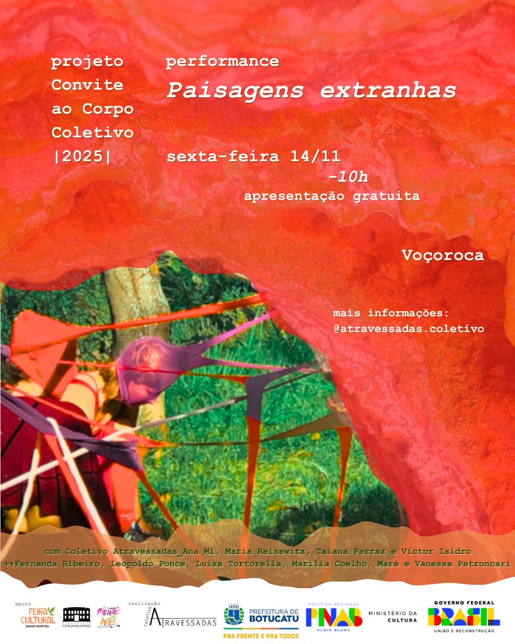 “Paisagens Extranhas” é uma dança/performance do Coletivo Atravessadas desenvolvida a partir das pesquisas e criações do grupo que envolvem a relação com a paisagem, com materialidades, com os objetos relacionais de Lygia Clark e com o corpo-coletivo. O trabalho, que já foi apresentado em diferentes espaços e paisagens, instaura-se sempre criando um diálogo entre as intérpretes criadoras, o público e o entorno. Neste projeto, essa escuta do ambiente também se aprofunda por meio das investigações que a artista proponente vem realizando em seu mestrado, relacionadas às paisagens e a formação geológica de Botucatu.