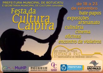 A partir da próxima segunda-feira, 18, a Prefeitura de Botucatu traz para o Município uma grande programação relacionada à música e cultura caipira. Pela primeira vez, a Secretaria Municipal de Cultura realiza a “Festa da Cultura Caipira”, que unirá música, exposições, literatura, cinema, oficinas, workshops, culinária, contação de histórias e outras atividades gratuitas nas instalações do Espaço Cultural “Antônio Gabriel Marão”.