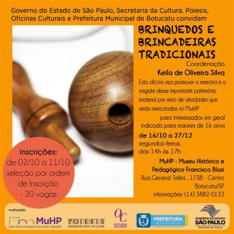 As tradicionais brincadeiras e modos de brincar fazem parte da nossa cultura e compõe um importante patrimônio imaterial. Esta oficina visa promover a memória e o resgate desse importante patrimônio imaterial por meio de atividades que serão executadas no Museu Histórico e Pedagógico de Botucatu. Serão realizados estudos e práticas do “brincar”, tendo como ponto de partida o bilboquê e diabolô, que estão em exposição e pertenceram à Inezita Barroso, importante defensora e difusora da cultura popular, além de outros itens do acervo e da memória coletiva, que “tanta saudade nos traz”.