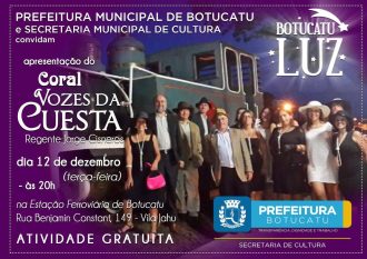 Nesta terça-feira, 12, o Botucatu Luz terá a apresentação do Coral Vozes da Cuesta, em frente à Estação Ferroviária, a partir das 20 horas. O grupo apresentará músicas natalinas e também outras canções que animarão a noite. Além do coral, as praças seguem iluminadas no Botucatu Luz.