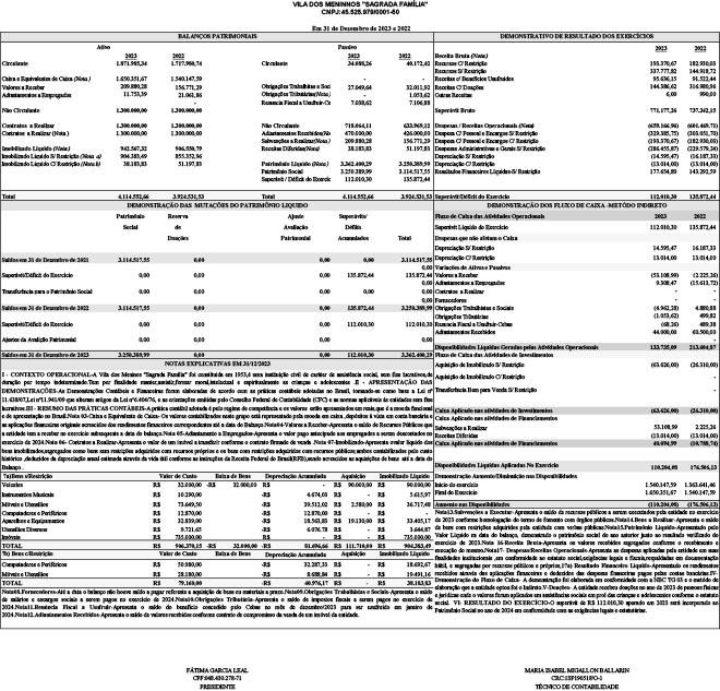 Balanço Patrimonial Vila dos Meninos “Sagrada Família” 13 março 2024
