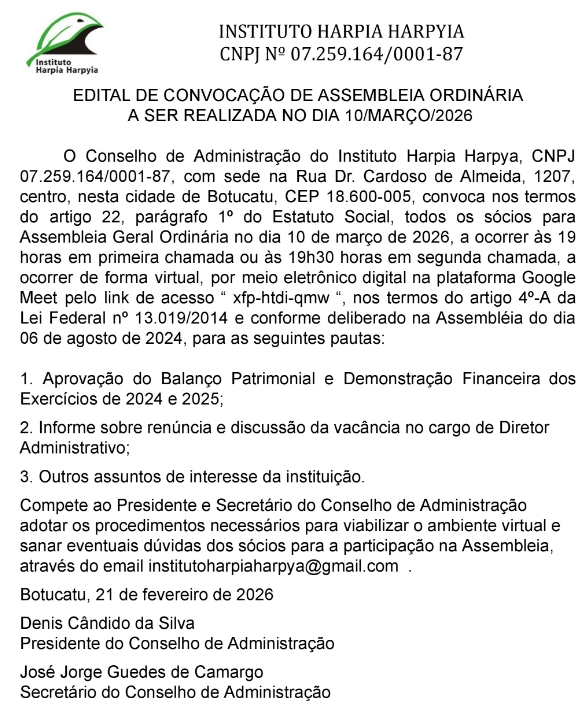 Edital de convocação Instituto Harpia Harpyia Botucatu Edital 20 fevereiro 2026 Compartilhe esta notícia Oferecimento Oferecimento Veja também Unimed Botucatu: Edital de Convocação de Assembleia Geral Ordinária 13 fevereiro 2026 Balanço Patrimonial – Centro Reg de Registro Atenção Maus Tratos na Infância (CRAMI) 03 fevereiro 2026 Balanço e Demonstração Financeira da Associação Botucatuense de Muay Thai 30 janeiro 2026 Balanço Patrimonial: Associação dos Deficientes Físicos de Botucatu (ADEFIB) 27 janeiro 2026 Edital de Convocação – Associação Botucatuense de Radioamadores Caipiras da Cuesta SP 05 janeiro 2026 EDITAL DE CITAÇÃO – 2ª Vara Cível de Botucatu 16 dezembro 2025 Oferecimento Apoiadores ‹ › × ‹ › ×