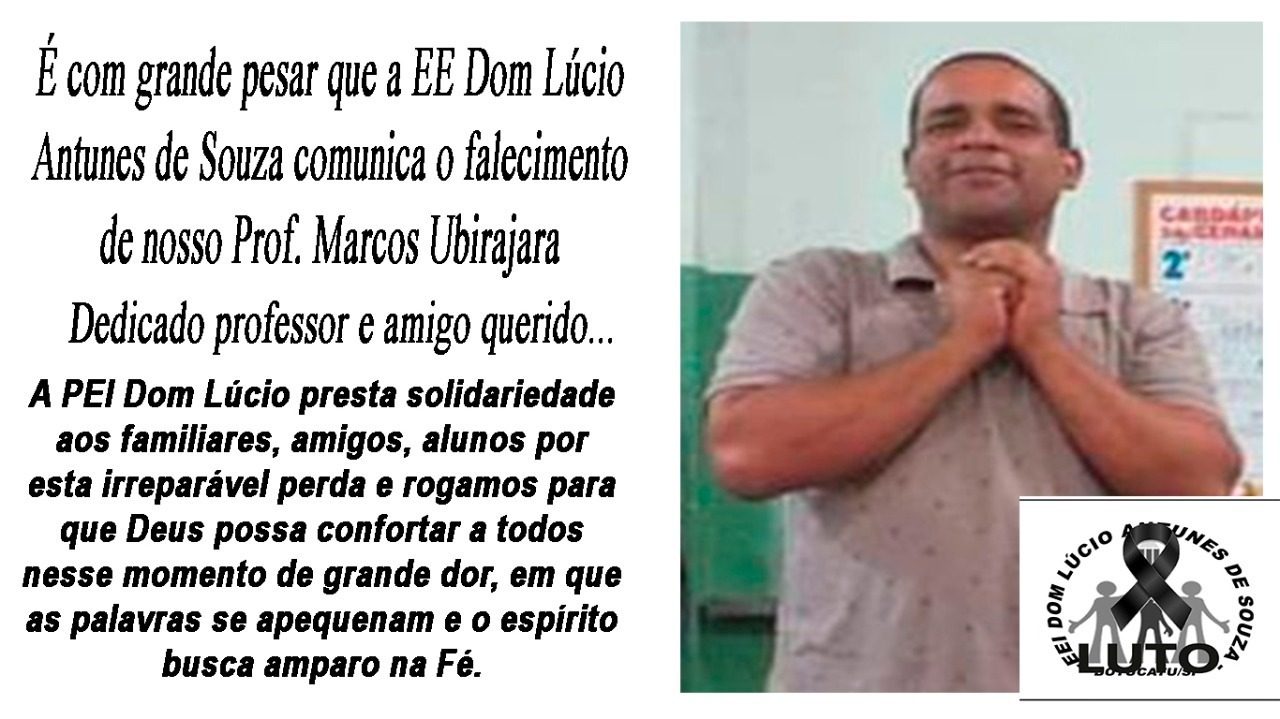 “É com grande pesar que EE Dom Lúcio Antunes de Souza comunica o falecimento do Professor Marcos Ubirajara, dedicado professor e amigo. A PEI Dom Lúcio presta solidariedade aos familiares, amigos e alunos por esta irreparável perda e rogamos para que Deus possa confortar a todos nesse momento de dor, em que as palavras se apequenam e o espírito busca amparo na Fé”, diz comunicado da escola Dom Lúcio.