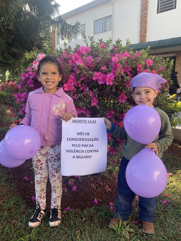 As crianças da do Centro de Educação Infantil José Luiz Amat realizaram uma ação de conscientização sobre o Agosto Lilás, mês dedicado ao combate à violência contra a mulher.