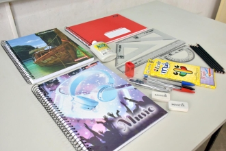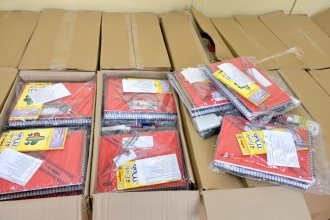 Os kits são compostos de acordo com as necessidades de cada nível de aprendizado, contendo desde massa de modelar para a Educação Infantil até cadernos universitários e canetas para o Ensino Fundamental.