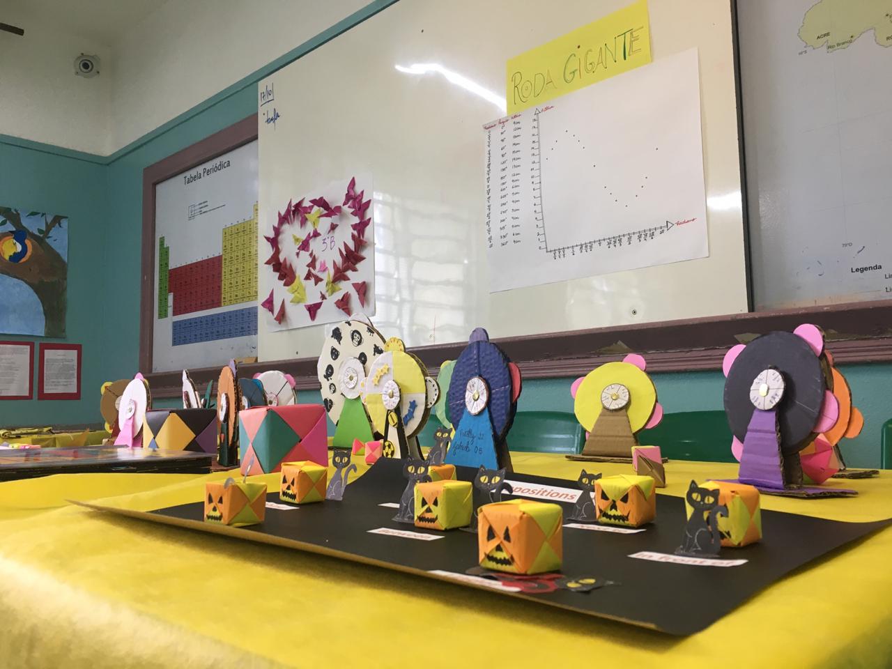Foi possível ver também o trabalho feito a partir do ciclo trigonométrico, valorizando conhecimentos matemáticos. Na exposição havia trabalhos de comemoração a festa de Halloween, onde surgiu e sua a influência em nossa cultura.
